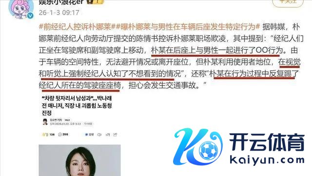 根据呈报书刻画,在某次使命出行途中,坐在后座的朴娜莱与别称男性公然发生亲密行径,而两名牙东谈主正分离坐在驾驶座和副驾驶座上。